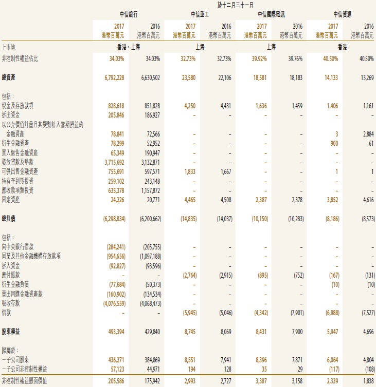 本公司的母公司和最終控股公司為中國中信集團有限公司(以下簡稱「中信集團」)。於2017年12月31日,中信集團 通過其境外全資子公司持有本公司58.13%的股權(2016年12月31日:58.13%)。