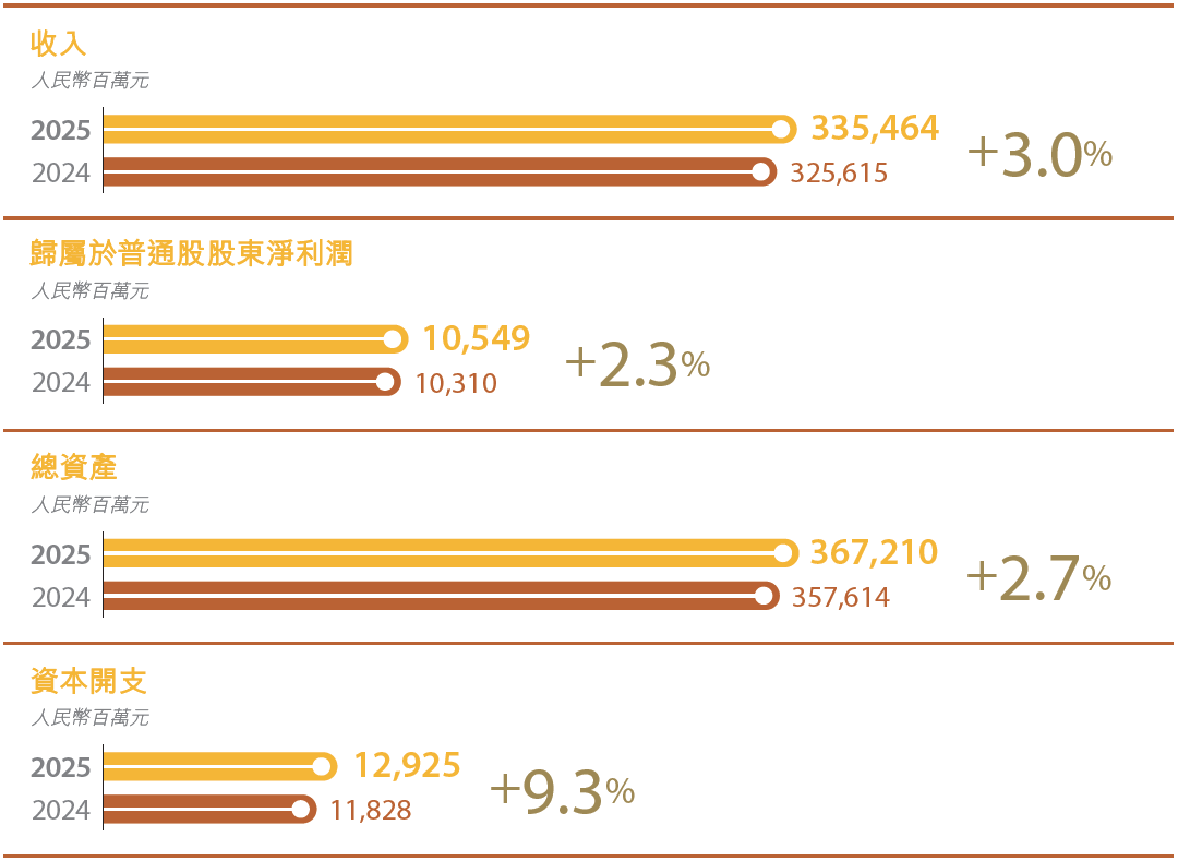 二零二五年,先進材料板塊實現收入3,354.64億元、歸屬於普通股股東淨利潤105.49億元,分別同比增長3.0%和2.3%。特鋼業務在市場需求不足、行業內卷加劇的大環境下,全年實現鋼材銷量3,021萬噸,同比增長2.5%;實現收入1,667.50億元、歸屬於母公司股東淨利潤54.12億元,分別同比下降2.9%和增長19.4%。兩家鋼企噸鋼毛利、歸屬於母公司股東淨利潤均有較大提升,協同效應逐漸彰顯。其中,中信特鋼歸屬於母公司股東淨利潤同比增長15.7%至59.29億元,南鋼股份歸屬於母公司股東淨利潤同比增長26.8%至28.67億元。中信金屬銅、鈮銷量同比實現「雙位數」增長,實現收入1,418.19億元、歸屬於母公司股東淨利潤26.89億元,分別同比增長9.6%和20.2%;秘魯邦巴斯銅礦項目運營穩定,分享收益增長超1倍。中信泰富能源積極推動新能源發電項目投產及參與綠電交易,綠電發電量同比增長94.0%,疊加傳統火電業務煤炭成本下降等利好因素,實現歸屬於母公司股東淨利潤14.04億元,同比增長22.2%,創歷史新高。